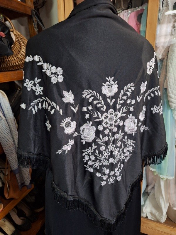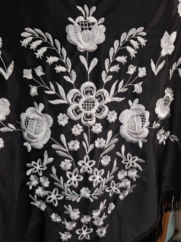 Mantón negro Bordado Blanco con flecos